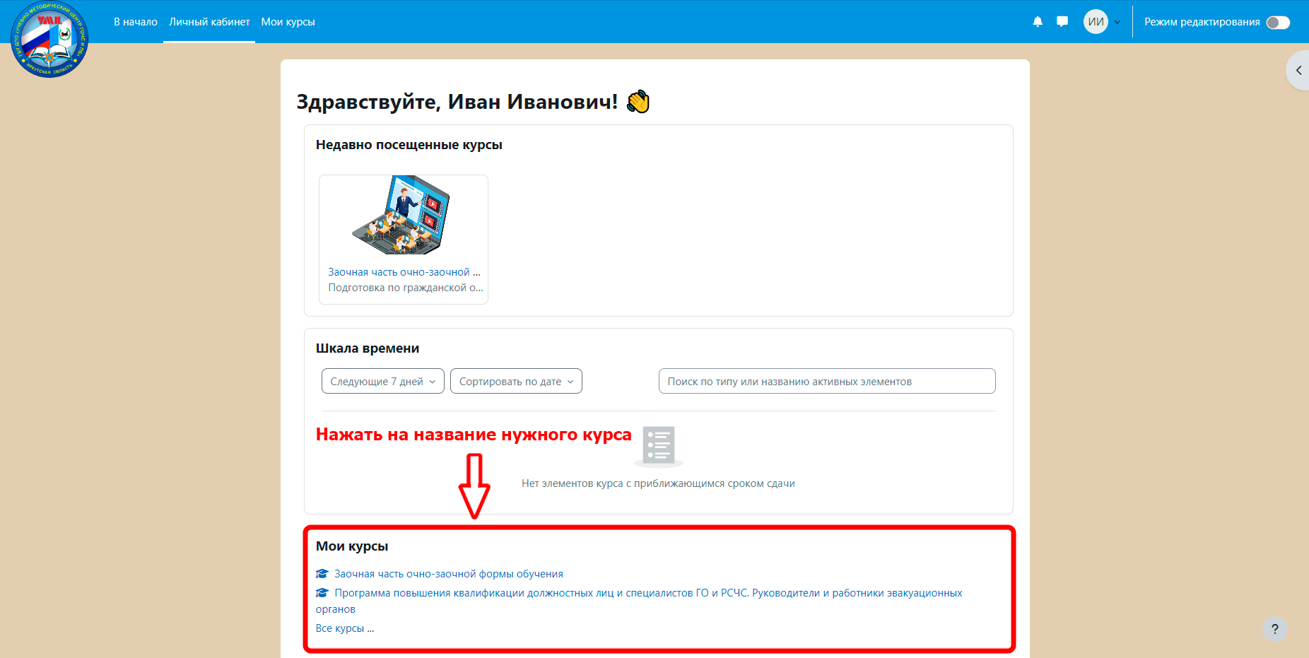 2. После авторизации вы попадете в личный кабинет. В нем есть раздел Мои курсы. Выберите нужный курс и нажмите на него.