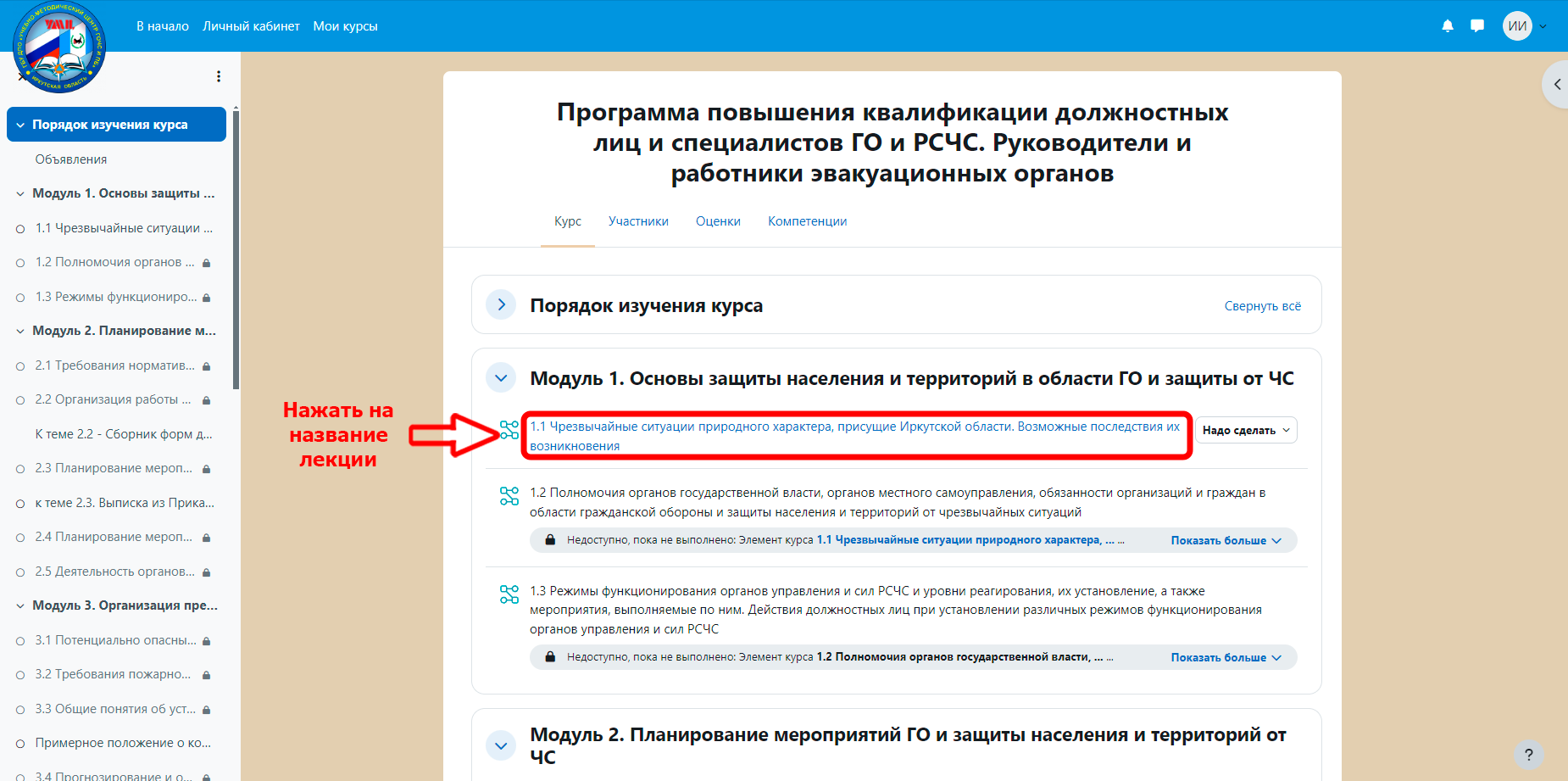 3. Открыть раздел курса и последовательно проходить каждую тему раздел. Пока не будут выполнены все элементы темы (лекция, тест), следующая лекция будет заблокирована и так до итоговой аттестации.
