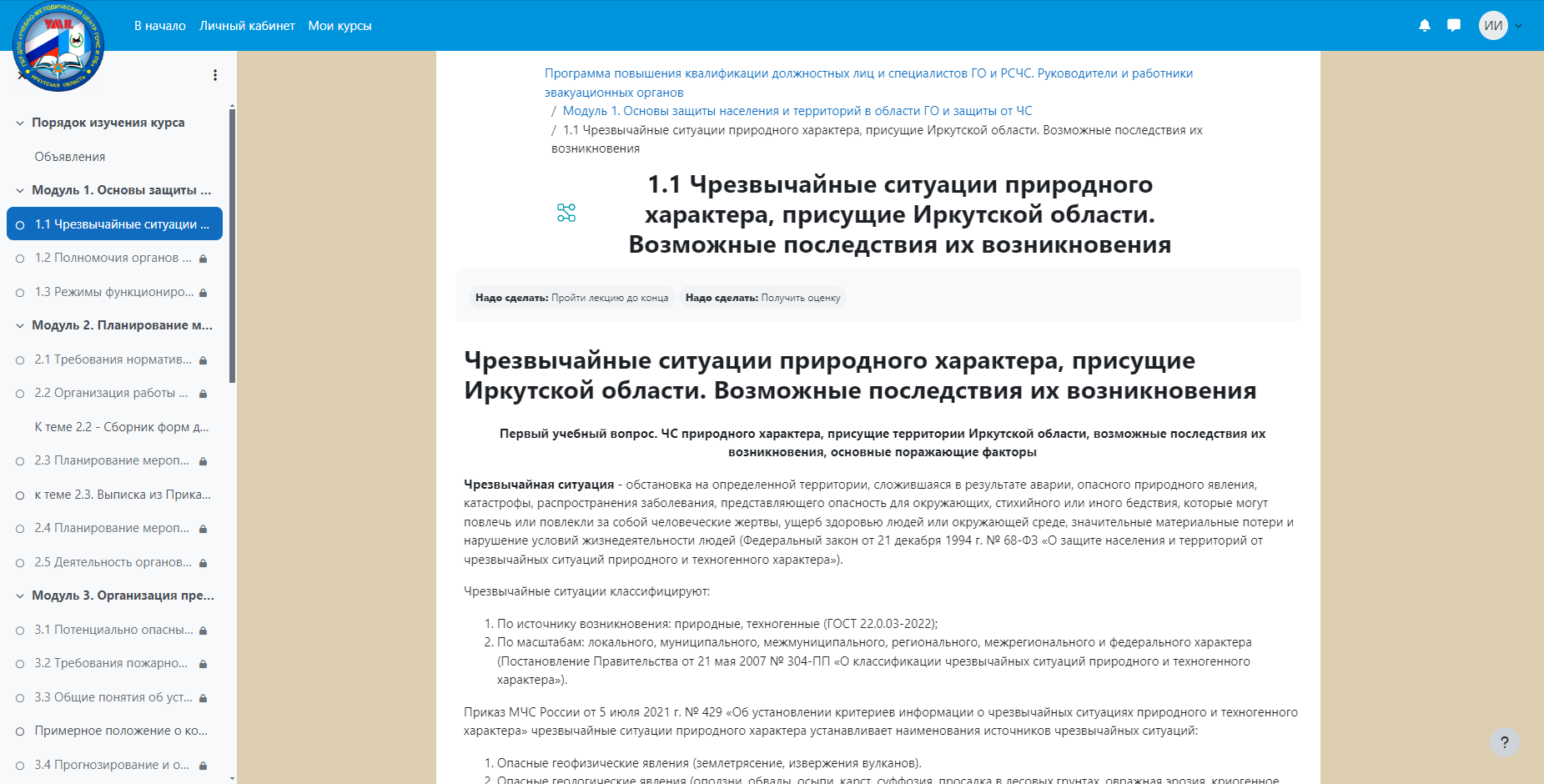 - Обучение заключается в онлайн-изучении лекций, просмотре видеолекций (при их наличии в курсе), прохождении промежуточного тестирования в виде тестов. Обучение завершается итоговым тестом. Для успешного завершения обучения необходимо изучить все лекции и пройти все промежуточные аттестации.